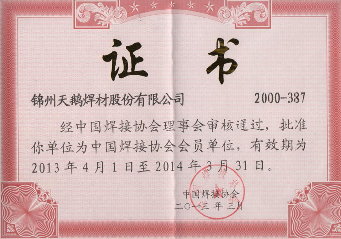 中國(guó)焊接協(xié)會(huì)會(huì)員證書
